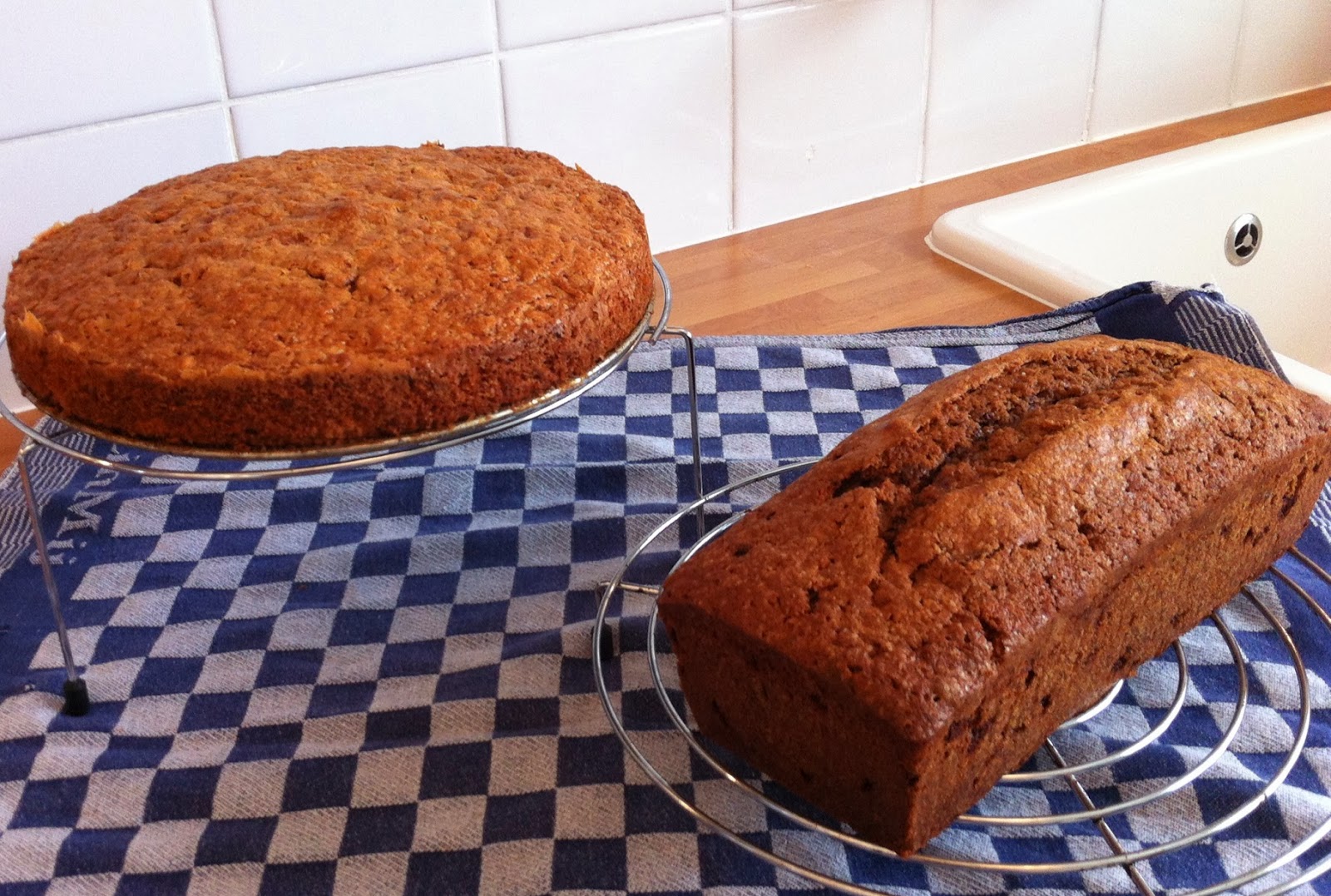 Here are both cakes cooling off., Bridget in the front, carrots in the back. Hier staan beide cakes af te koelen, Bridget vooraan, de worteltjes achteraan. |